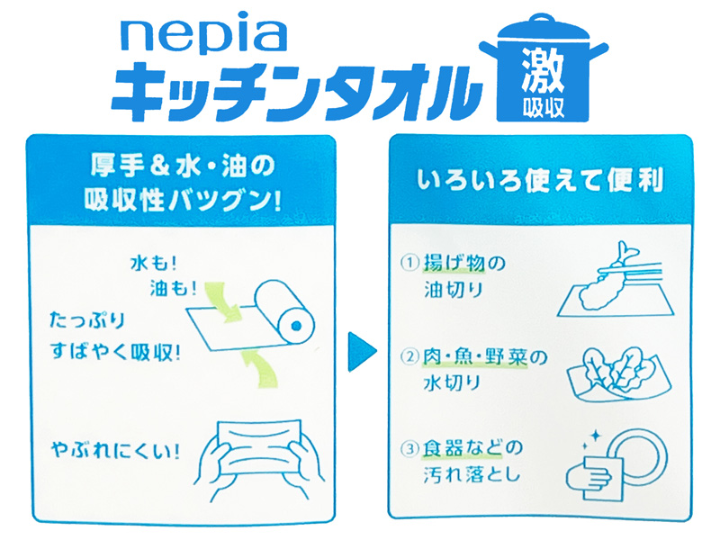 水や油をしっかり吸収。濡れても破れにくい!『ネピア激吸収キッチンタオル 2ロール50カット』です。