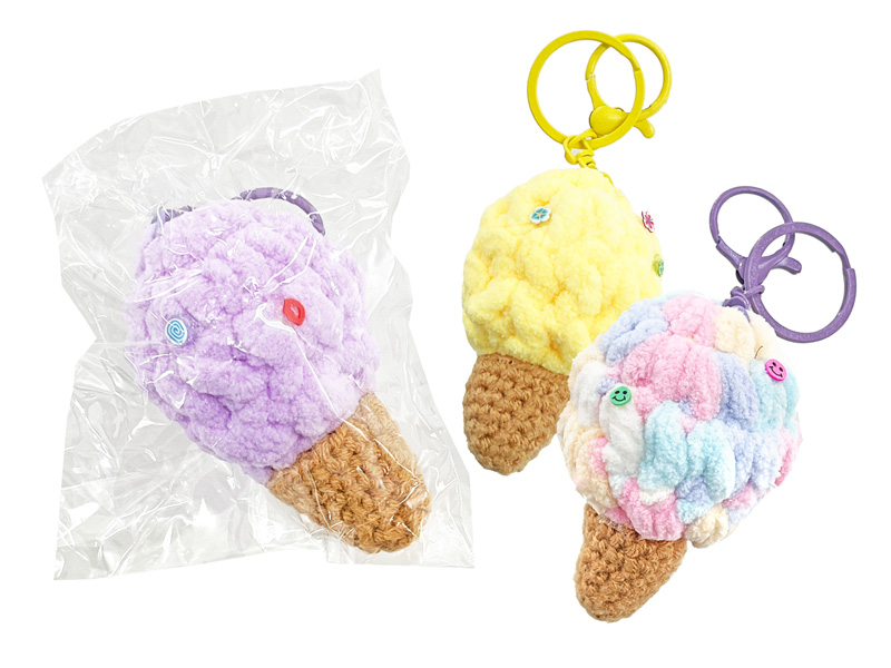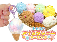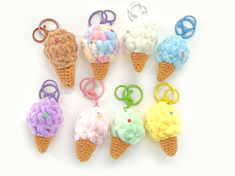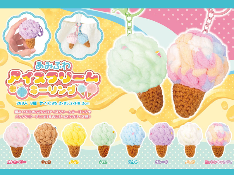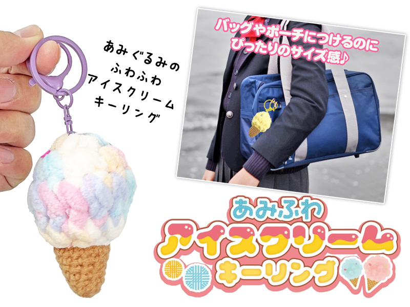 ふわふわキュートなアイスクリームの編みぐるみキーリングが登場♪アイスのバリエーションは全8色。全長約8cmのマスコットはキーホルダー付きで通学バッグやポーチに付けるのにぴったりのサイズ感です♪