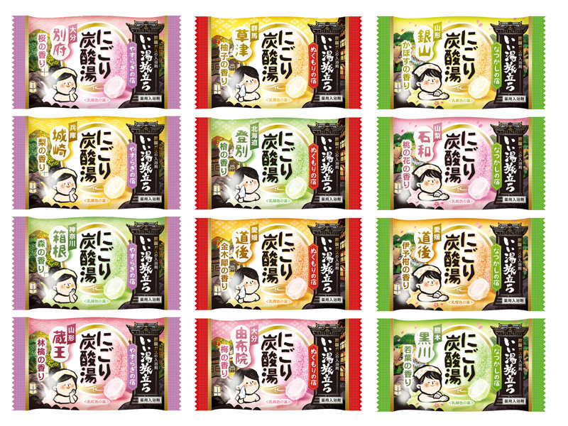 - 《風情漂う香り12種類》・北海道/登別:湖畔を包む檜の香り〈乳緑色の湯〉/・群馬/草津 :山々に実る柚子の香り〈乳黄色の湯〉/・愛媛/道後 :可憐に咲き誇る金木犀の香り〈乳橙色の湯〉/・大分/由布院:ふわりと芳醇に香る梅の香り〈乳桃色の湯〉/・山形/蔵王 :たわわに実る林檎の香り〈乳紅色の湯〉/・神奈川/箱根:山裾を包む森の香り〈乳緑色の湯〉/・兵庫/城崎 :瑞々しくもぎたての梨の香り〈乳黄色の湯〉/・大分/別府 :ほんのり華やぐ桜の香り〈乳桃色の湯〉/・山形/銀山 :碧く艶めくかぼすの香り〈乳黄色の湯〉/・山梨/石和 :ふわりと優しい桃の花の香り〈乳桃色の湯〉/・愛媛/道後 :さわやかに甘酸っぱい伊予柑の香り〈乳橙色の湯〉/・熊本/黒川 :柔らかく瑞々しい若葉の香り〈乳緑色の湯〉