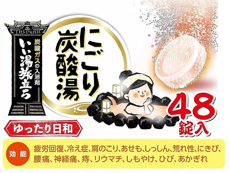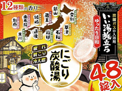 ご自宅のお風呂で毎日にごり湯の温泉気分を楽しめる!薬用発泡入浴剤『いい湯旅立ちにごり炭酸湯・ゆったり日和』パックが登場~♪こちらは48錠入のアソートパック。12種類の風情漂う香りが日替わりで楽しめます。炭酸ガスが温浴効果を高め血行を促進し、冷え症や肩こり・腰痛に効果があり、一日の疲れをやわらげます。保湿成分(チンピエキス、ショウガエキス)配合でしっとりした湯上がり感です。