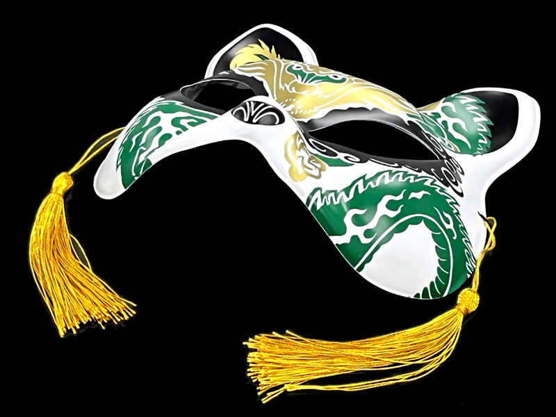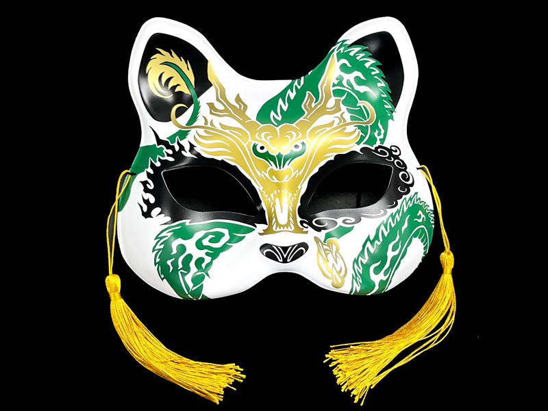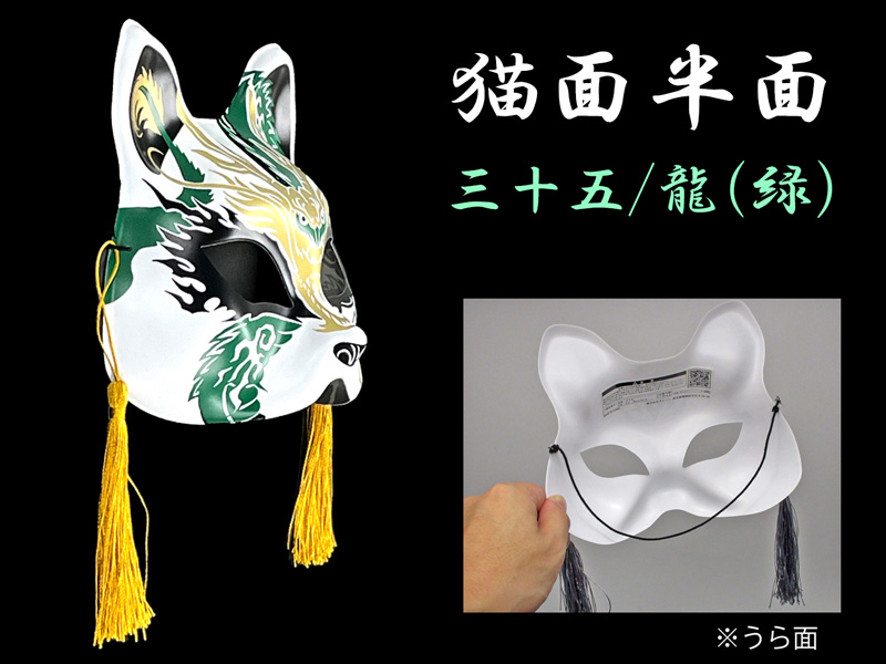オリエンタルな雰囲気が魅力的な猫半面にニューバージョンが登場!深みのある緑が龍の存在感を引き立てるデザインとなっております。縁日お祭りのお面にはモチロン、コスプレ仮装・お芝居や劇の小道具、フォトジェニックなアイテムとしても活躍しそうです。