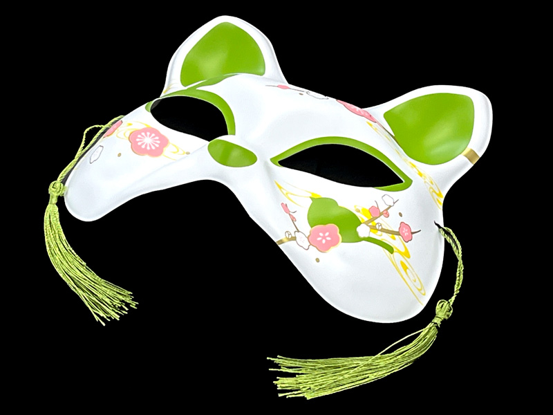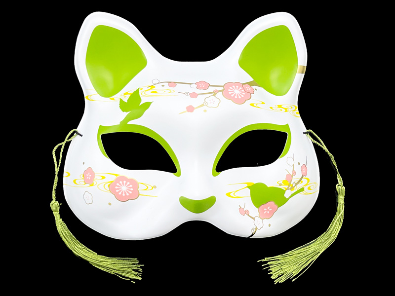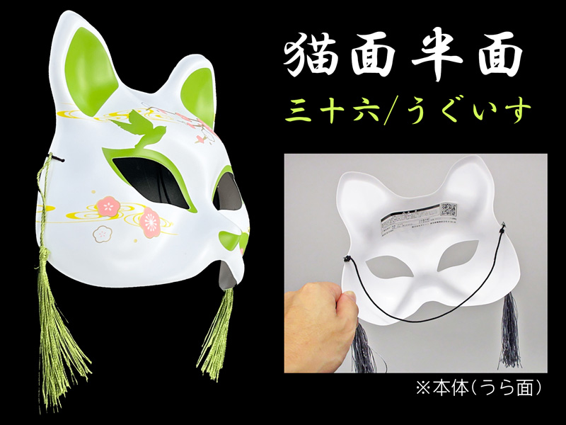 大人気の猫半面に新柄が登場~♪コチラは『梅とウグイス』の図柄がなんとも可愛らしい和風猫面です。縁日お祭りのお面にはモチロン、コスプレ仮装・お芝居や劇の小道具、フォトジェニックなアイテムとしても活躍しそうです。