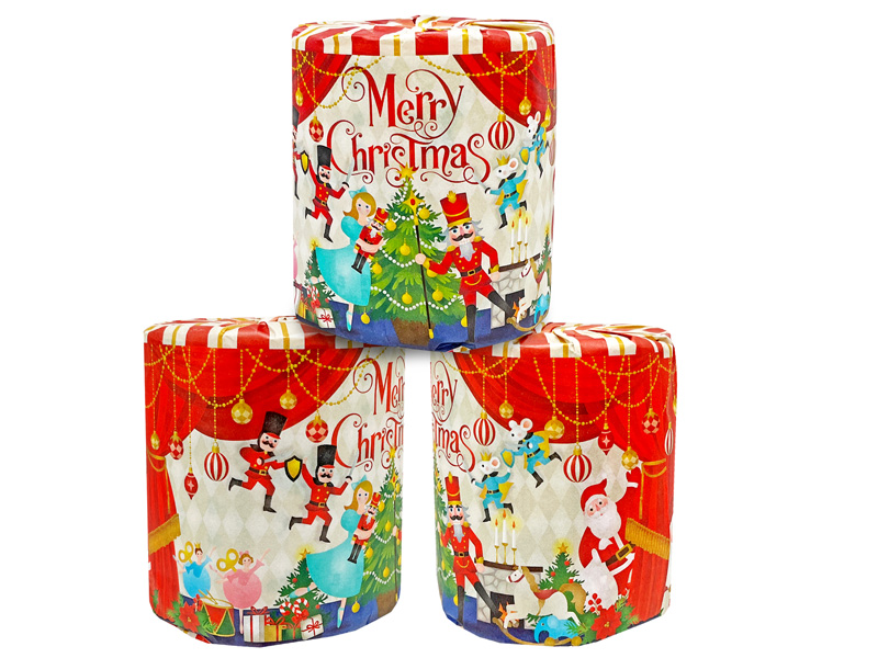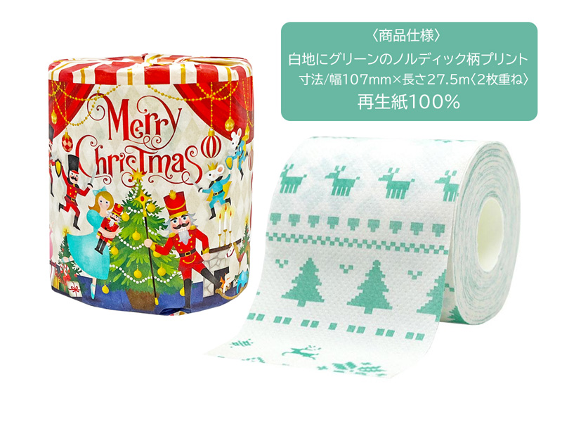 クリスマスシーズンにぴったりのトイレットロールが今年も登場~♪華やかなクリスマスパッケージの包装紙の中にはノルディック柄がプリントされたペーパーロールが入っています。もらってうれしい消耗品ノベルティ。会場で山積みにしておくだけでも注目度バツグン。イベントムードを盛り上げてくれます。クリスマスイベントのノベルティや、ゲーム・抽選の景品にぴったりです。