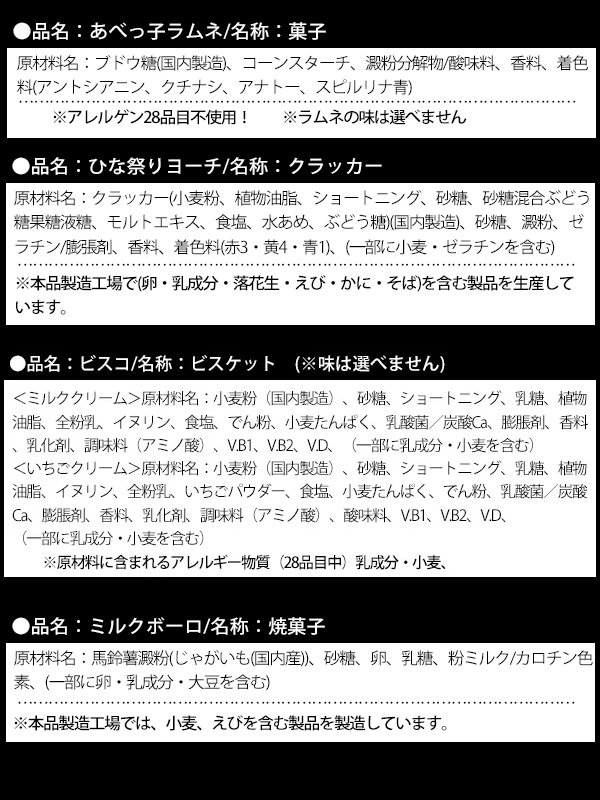 - セット内容:雑貨(桃の花かざり×1) お菓子(・ひな祭りヨーチ×2・あべっ子ラムネ×1・イワモトのミルクボーロ×1・ビスコ(味は選べません)×1)