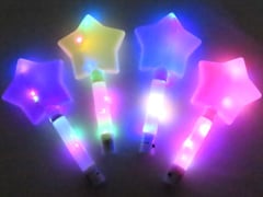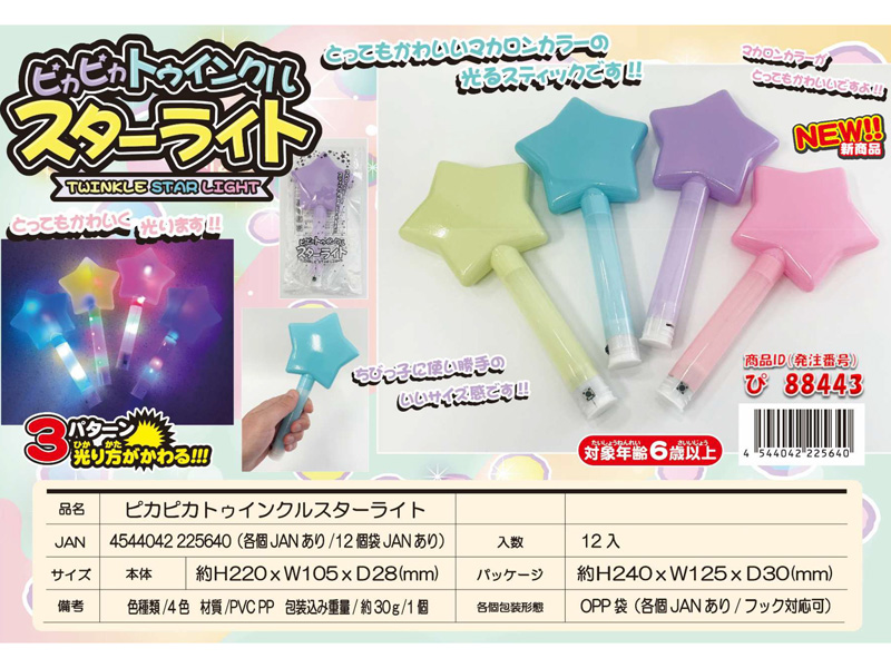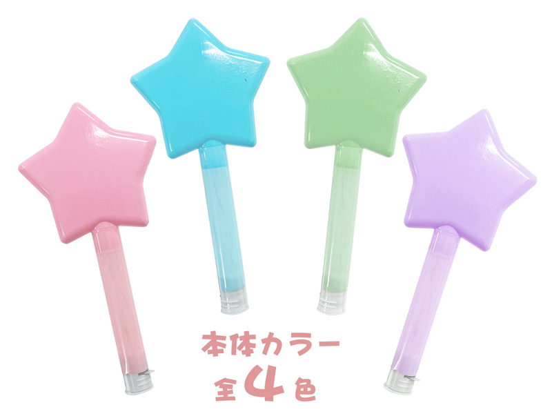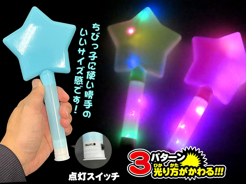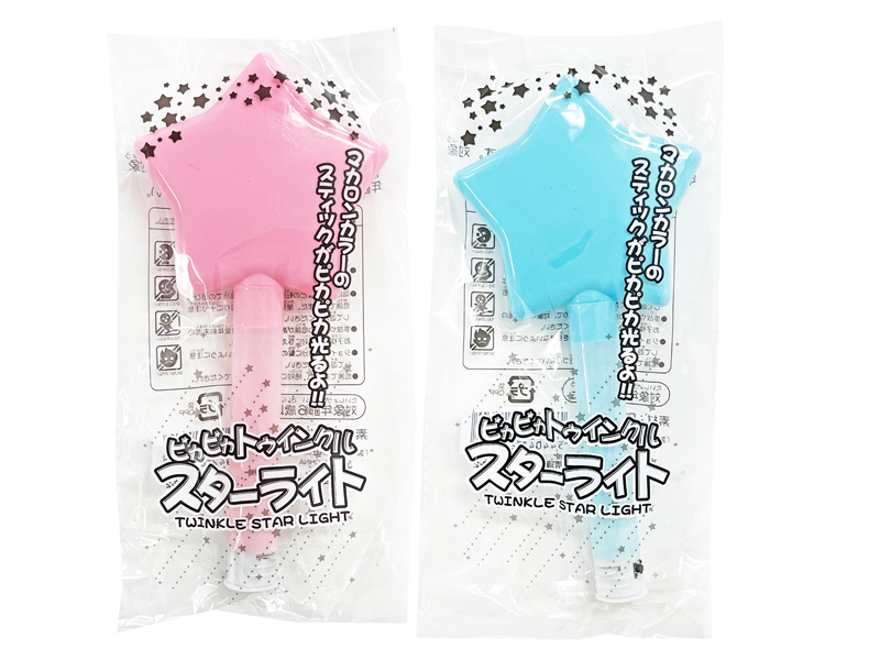 とってもかわいいマカロンカラーの光るスタースティックが登場♪持ち手の下にあるボタンを押すと…スティック全体がピカピカ光る☆彡持ち手が短いのでちびっ子に使い勝手のいいサイズ感です。光るスティックはお祭り・縁日の景品にはモチロン、冬のウィンターイベントなどにもとっても人気があります。