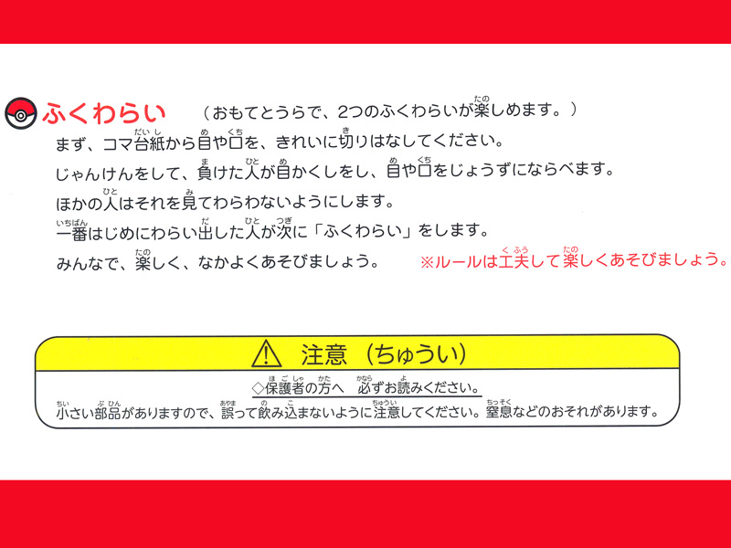 大人気ゲーム・アニメ『ポケットモンスター』のすごろく福笑いセットが今年も登場~!正月の定番の遊びと言えば何といっても、福笑いとすごろくですよね♪すきなキャラクターのコマで、1番はやく上がって正月早々いい夢見よう。お正月やクリスマス会・年末年始のプレゼント景品にゼヒ!