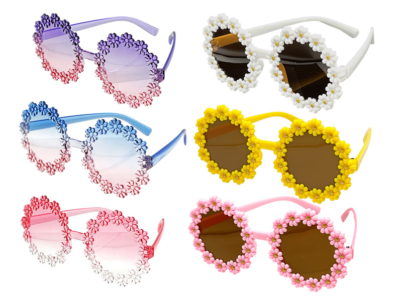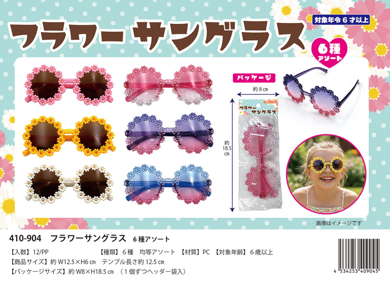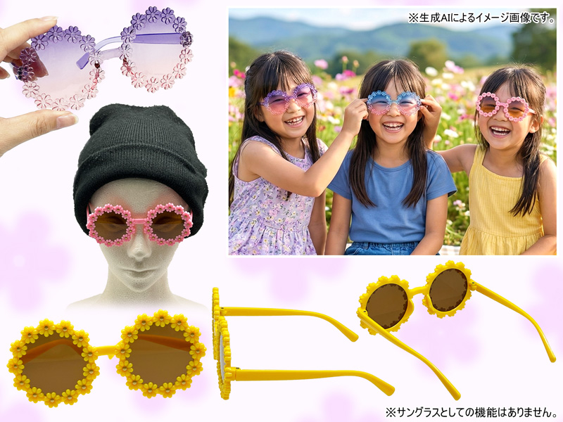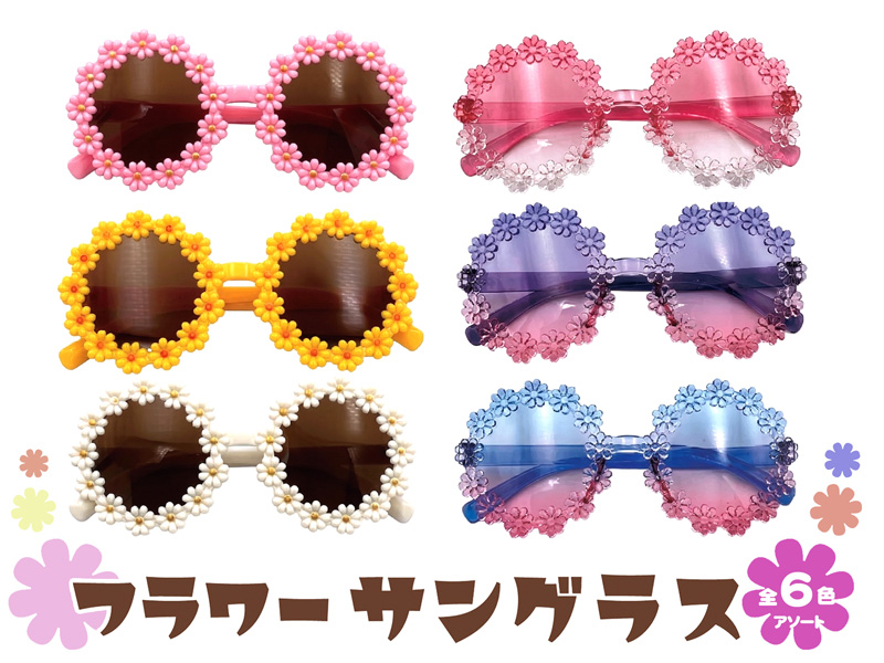 フレームのカタチがお花になった眼鏡…その名も『フラワーサングラス』が登場~♪本体カラーは全6色展開。個別包装されておりますので、イベント景品などにもおすすめです。