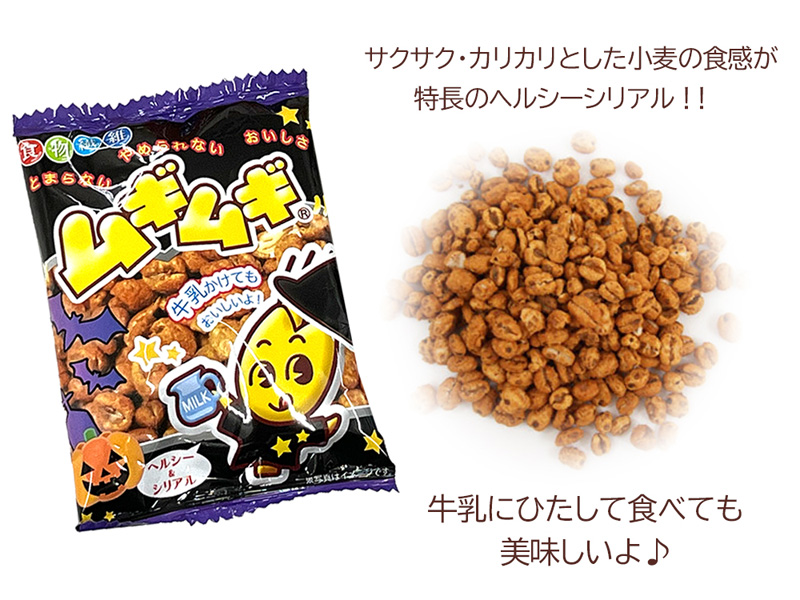 とまらない♪やめられない♪おいしさ♪牛乳をかけてもおいしい~!『ムギムギ』がハロウィンパッケージになって登場です!こちらは…サクサク・カリカリとした小麦の食感が特長のヘルシー&シリアル。大袋の中に30個入っていますので、大人数の集まるイベントの配布用にもオススメです。