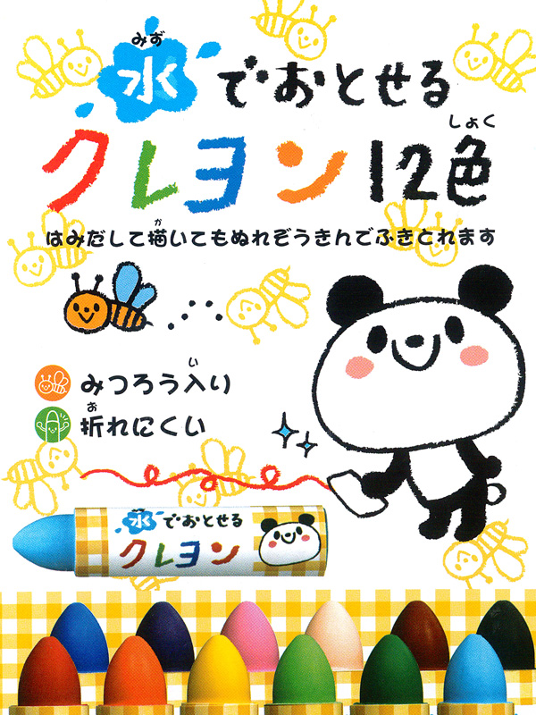 「汚れ」に着目した幼児向けのクレヨンです。体についても水で洗えば容易に落とせます。はみ出して描いてもぬれぞうきんでふき取ることができます。みつろうを原材料に使用しています。力いっぱい握って描いても折れにくい太さ。持ち運ぶときに散らばりにくいゴム付きケース。元の場所にかたづけやすい色名シール付き。