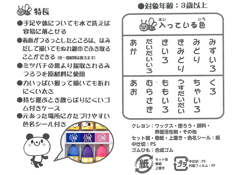 - クレヨン素材:ワックス、蜜ろう、顔料、界面活性剤、その他、
