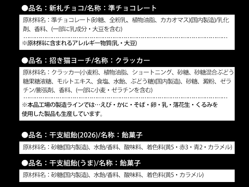 - (ギフト1個あたりのセット内容)…(お正月組飴×2種(各1入)・新札チョコ×1・招き猫ヨーチ×1)