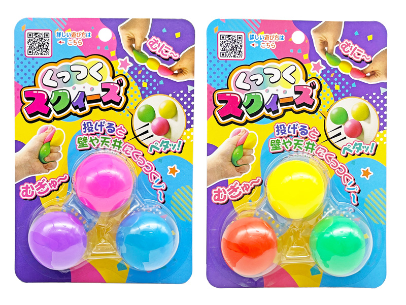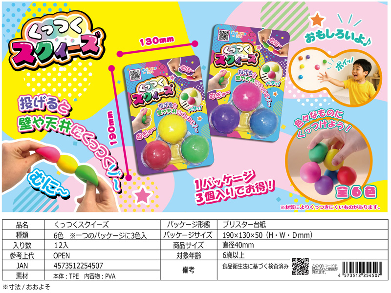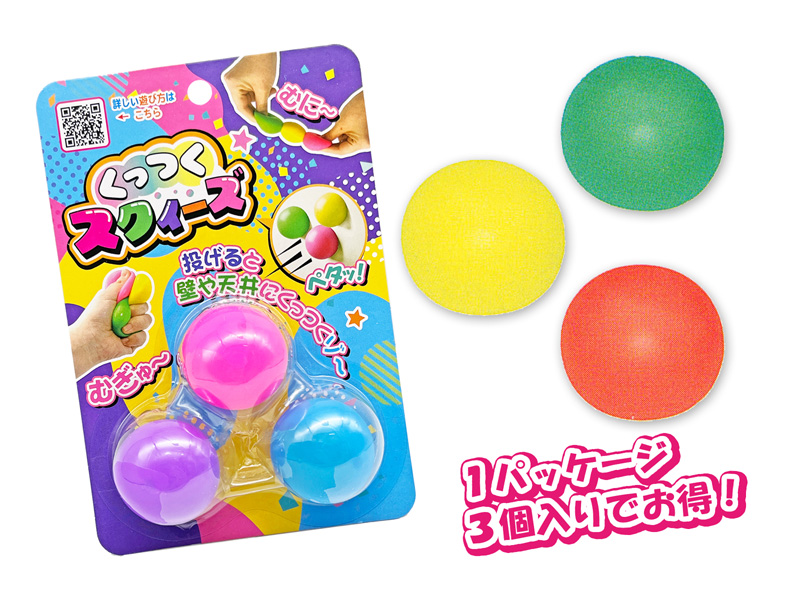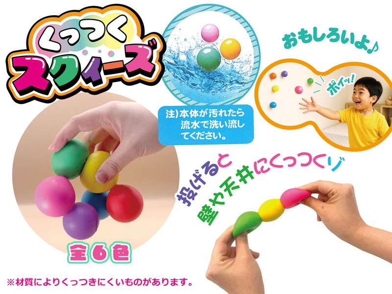 握ればぷにゅっと気持ちいい!投げればピタッとくっついてびっくり!新感覚おもちゃ『くっつくスクイーズ』は遊び方いろいろ!友だちと的当てをしたり、天井に投げて誰が長くくっつくか競争したり、工夫次第で楽しみ方は無限大♪かわいい色のボールを集めて遊んでみてネ。