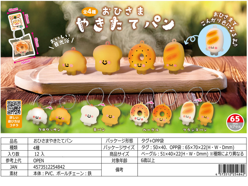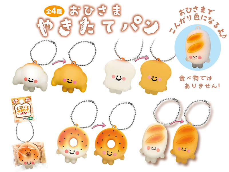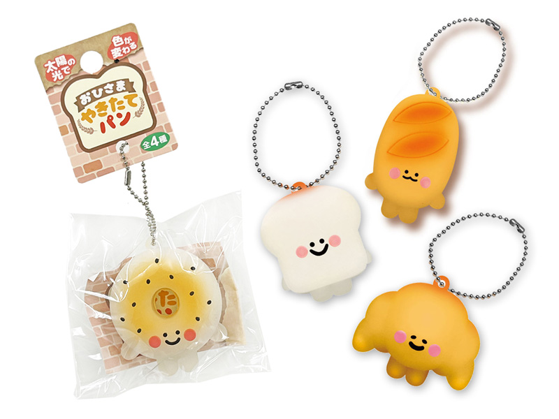おひさまで色が変わる!?かわいい焼きたてパンのマスコットが登場♪お日様にあてることで真っ白なパン達がこんがり色に変わるヨ♪マスコットは全4種類。ボールチェーンが付いておりますので、かばんなどに下げてお使いいただけます。