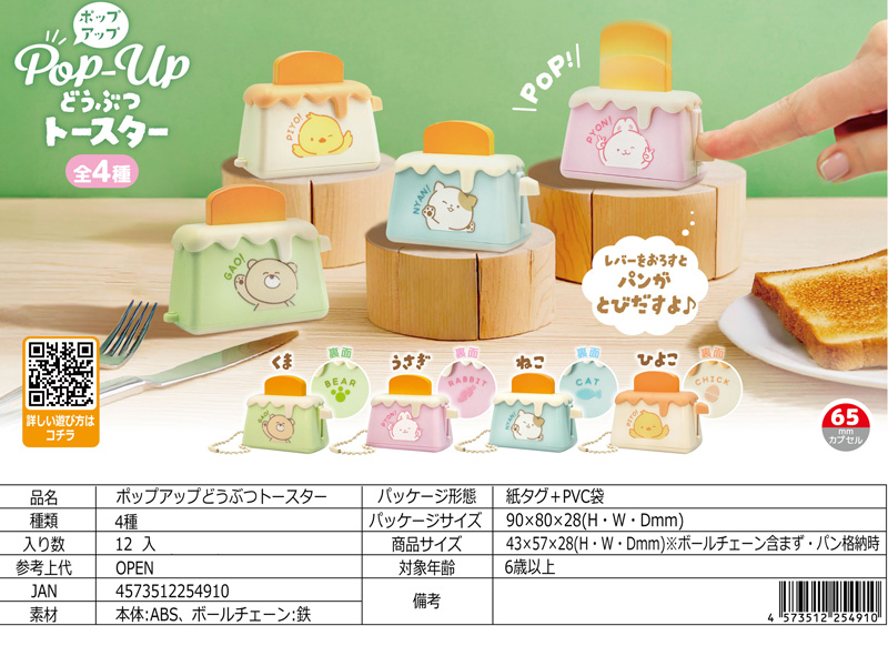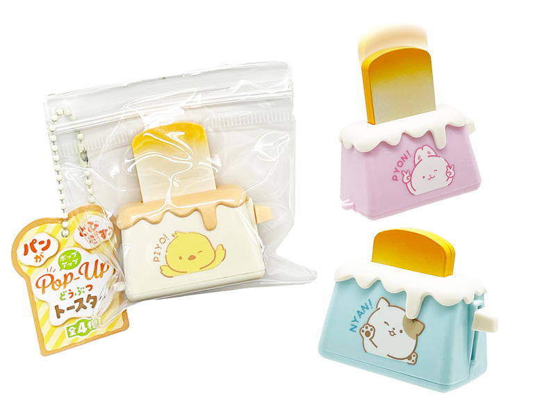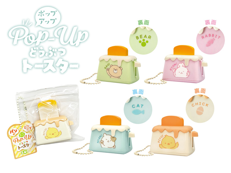 レバーをおろすとパンがとびだす!『ポップアップどうぶつトースター』が登場♪レトロなポップアップトースターは小さいながらもパンが飛び出すギミック付き。商品は1つずつボールチェーン付のジップケースに入っているため、かばんなどに下げてお使いいただけます。