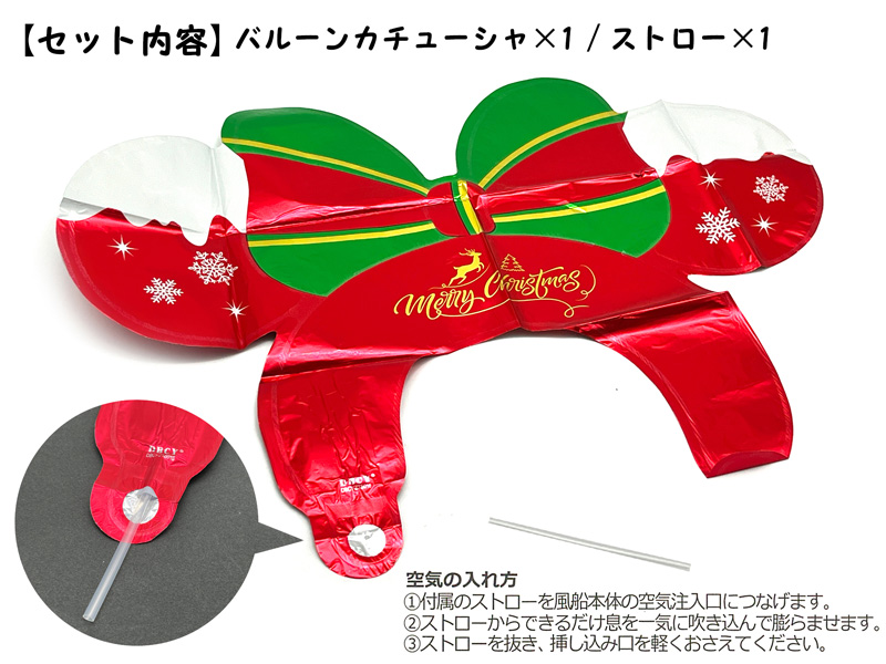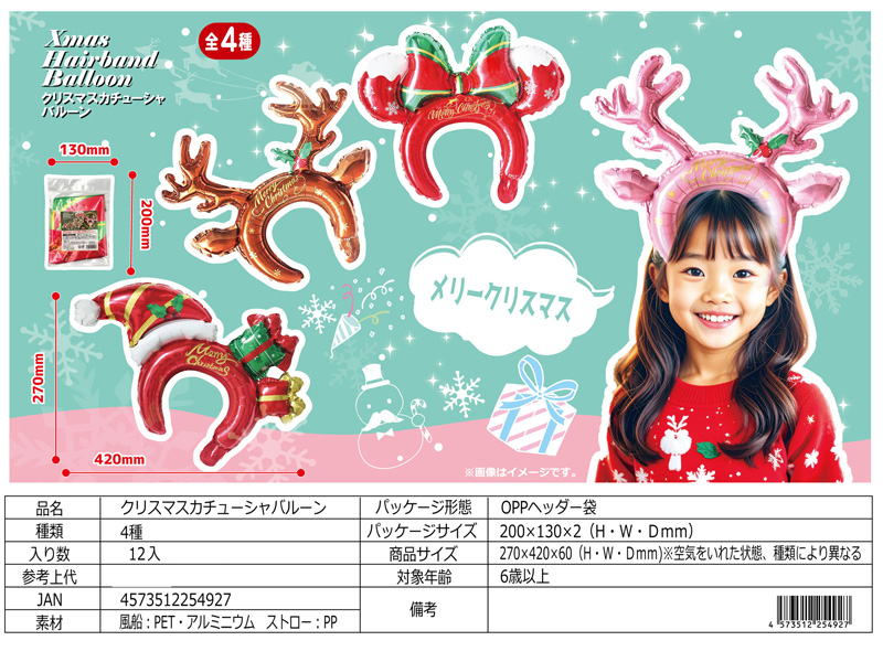 クリスマス会にぴったり!かわいいカチューシャタイプのバルーンです。クリスマスモチーフのキュートなバルーンは付属のストローで膨らませてから頭につけることができます。クリスマス気分が盛り上がるかわいいカチューシャ♪保育園や幼稚園、子供会でのクリスマス会景品やクリスマスイベントの景品におすすめです!