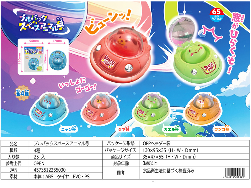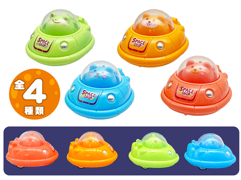 コロンとしたUFO型のフォルムが愛らしい、宇宙船型プルバックカーが登場!! 本商品は、後ろに引いて手を離すとビューンッ!と走り出す、プルバック式おもちゃです。ただ走るだけでなく、透明なドーム型の窓が「パカッ」と開閉するギミック付きなのも最大の魅力♪可愛らしいアニマル宇宙船は全4種アソート。1個ずつ個別包装されているため、景品やプレゼントにも渡しやすいです。