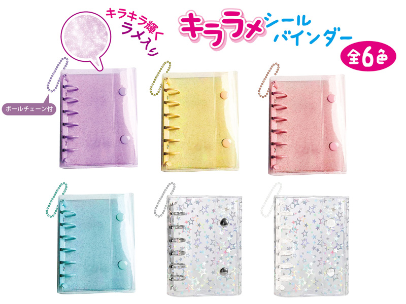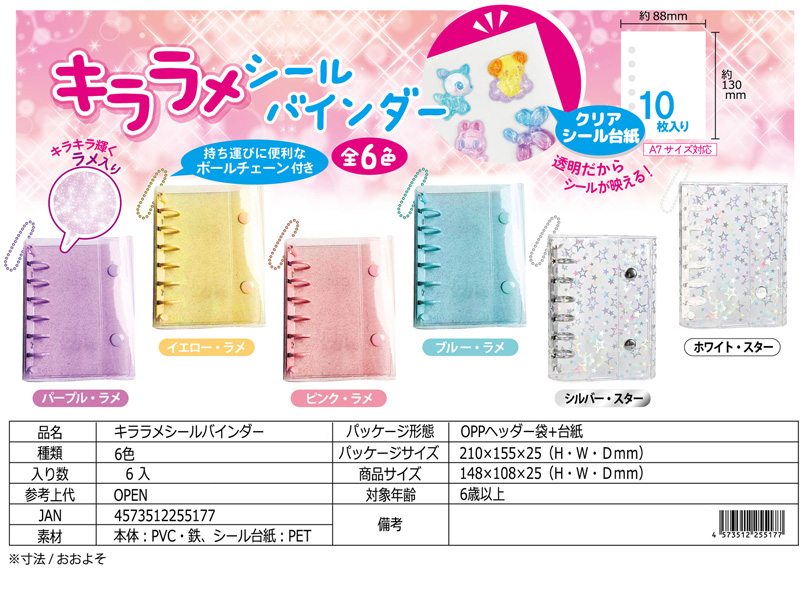 全長約14.8cm。キラキラのラメが目を引く、かわいいシールバインダーが登場~♪お気に入りのシールをまとめて収納でき、コレクション用としても大活躍。台紙10枚付きで、見た目の可愛さから持っているだけでも気分が上がります。本体カラーは全6色展開!個別包装されているため、イベントやくじ当てなどの景品・プレゼントなどにもおすすめです。
