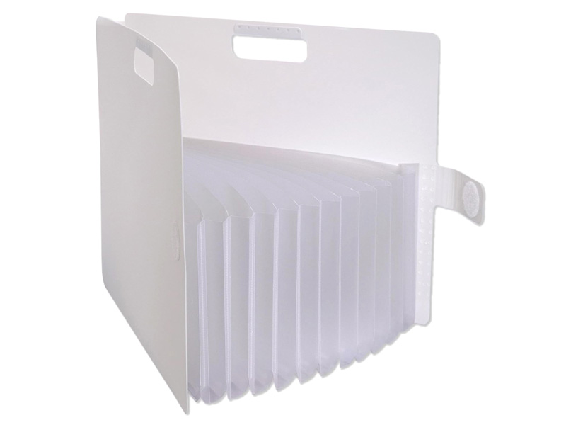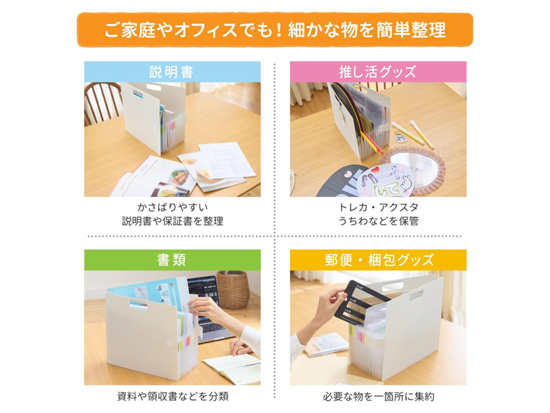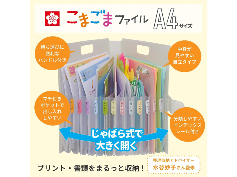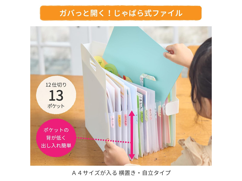 13ポケットで手軽に整理。お子様のプリントやノート、各種書類などの整理・収納できる じゃばら式のA4ポケットファイルが登場!横型ファイルなので、ポケットの間口が広くて出し入れしやすい。自立するので中身が一覧できて選びやすい。ハンドル付きで持ち運びしやすい。インデックスシール付きで分類がしやすい。面ファスナーで開け閉め簡単です。