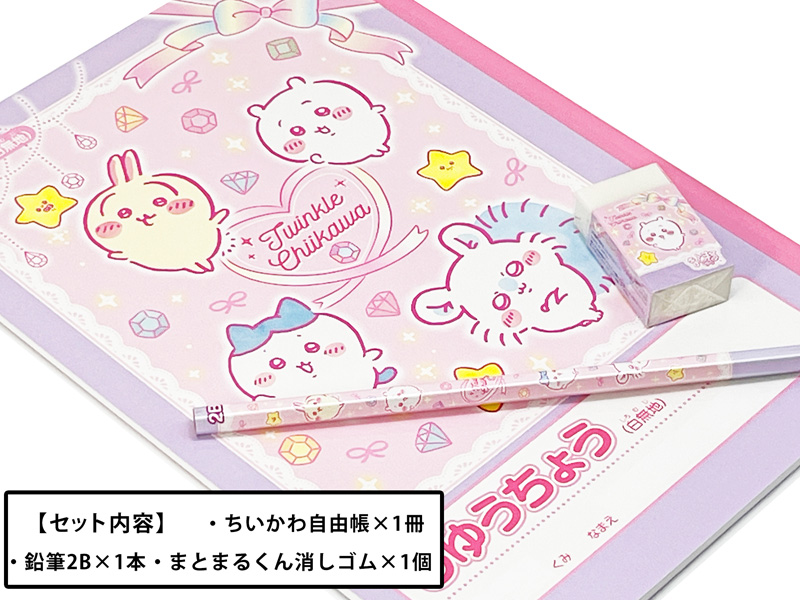 大人から子どもまで幅広い世代に人気の「ちいかわ」よりステーショナリー文具セットが誕生~♪OPPの袋の中には、自由帳に2B鉛筆・学習用消しゴムの3点が入っています。大好きなキャラクターと一緒なら勉強もはかどっちゃうかも♪♪進級・新入学・卒園のお祝い・記念品などのプレゼントにも喜ばれそうなキャラクターグッズです☆
