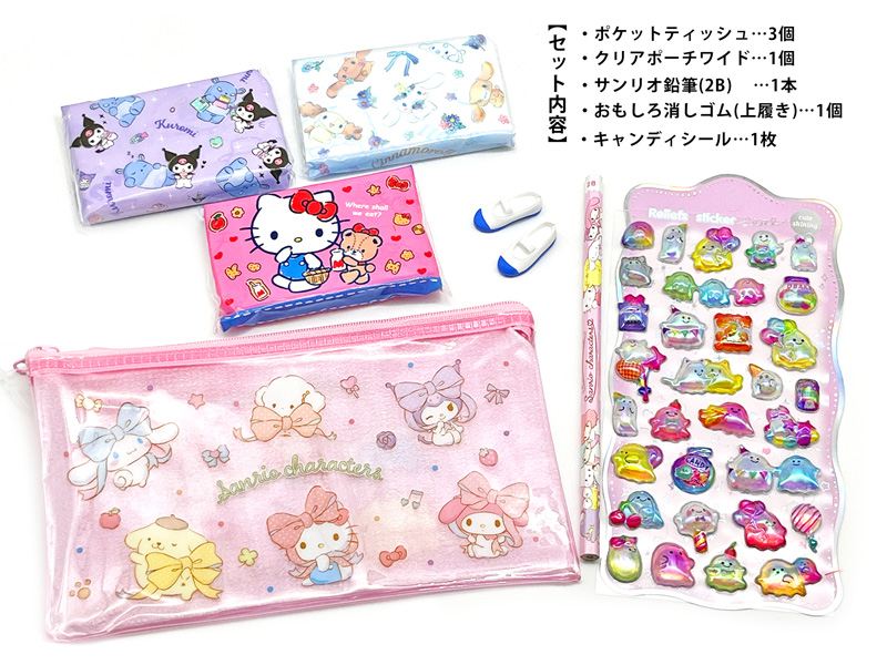 - セット内容…(クリアワイドポーチ×1個 サンリオ鉛筆(2B)×1本 ポケットティッシュ×3個 キャンディシール×1枚 おもしろ消しゴム(上履き)×1)