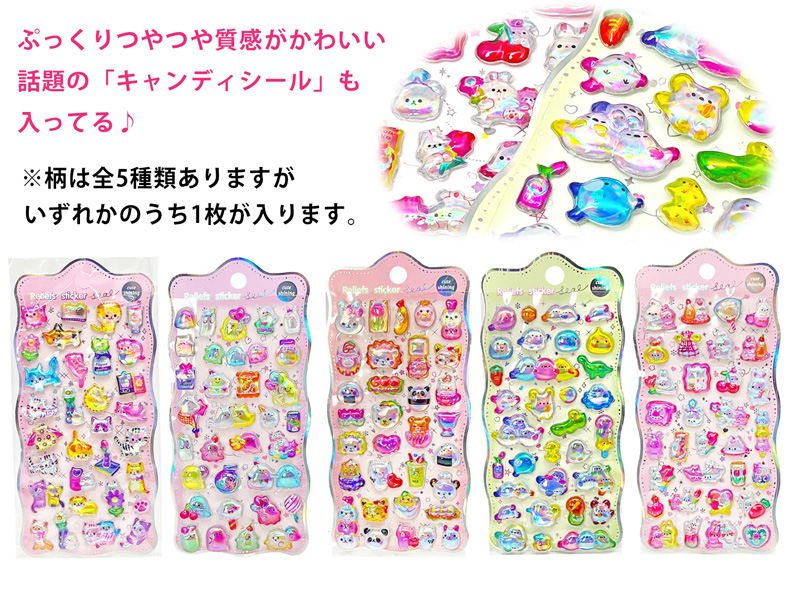 いま話題のぷっくりつやつやの「キャンディシール」とサンリオのクリアポーチを使用した進級お祝いギフトが登場~♪袋の口の部分にはるで本物のキャンディみたいなツヤ感の立体シールと上履きのカタチの消しゴムが!さらに袋の中にはペンポーチとしても使えるクリアワイドポーチに2B鉛筆、ポケットティッシュといった文具・雑貨が入っています♪卒園・進級のお祝い・記念品・プレゼントにゼヒともご利用ください!