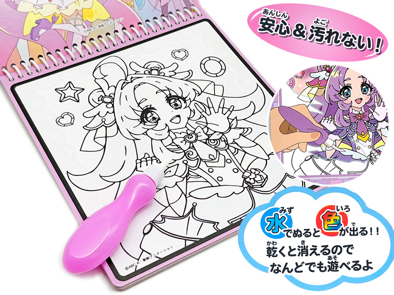 水を含んだ筆で絵の上をなぞると色があらわれる!「名探偵プリキュア!」の不思議なみずぬりえが登場♪ぬりえについた色はかわくと消えるので何度でも繰り返し遊べちゃいます♪ちなみに今回の作品は「探偵」をモチーフに、「自分で見て、感じて、考えて、“本当”の答えを出す」をテーマに、「困っている人を助けたい」という思いを胸に探偵として活躍する物語となっています♪