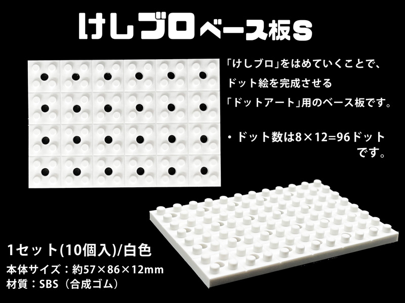 イワコーグローバル株式会社が展開する、消しゴム素材でできたブロックを組み立てる新しい工作知育玩具【けしブロ】が登場!こちらは「けしブロパーツ」をはめていくことで、ドット絵を完成させる「ドットアート」用のベース板Sサイズです。ドット数は8×12=96ドットです。