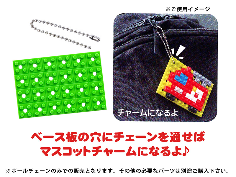 イワコーグローバル株式会社が展開する、消しゴム素材でできたブロックを組み立てる新しい工作知育玩具【けしブロ】が登場!こちらはカスタムアイテム「ボールチェーン」です。ベース板の穴にチェーンを通せばマスコットチャームとしてもご使用いただけます。