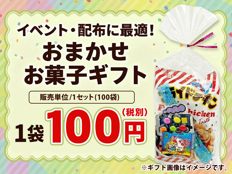 【※納品は最短でも10日~かかります。一緒にカートに入れた商品も同じ納期になるので、不都合がある場合はご注文を分けてください。】各種イベント配布に最適な、おまかせお菓子ギフトセットが登場~!こちらは1袋あたり100円(税別)のお菓子詰め合わせセット。子供たちにウケのよいお菓子が約4種類程入っています。1セット(100袋)単位からのご発注となりますので、大規模なイベント・催事で多くのギフトが必要な際に大変オススメです。