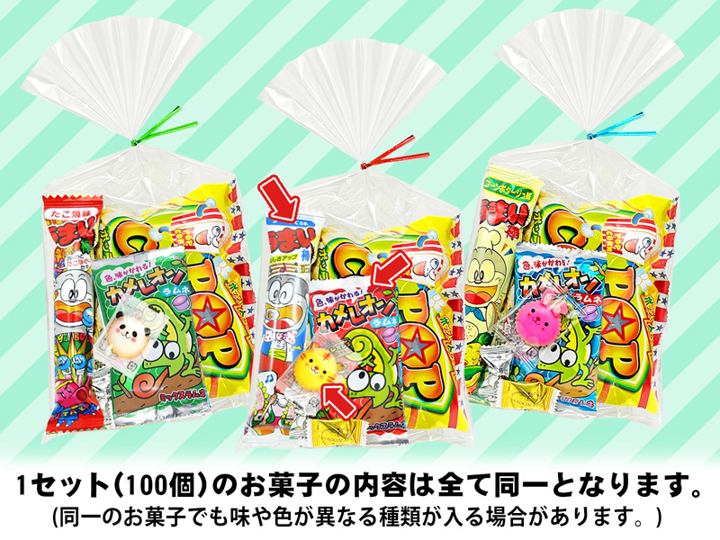 - 1セット(100袋入)のお菓子はすべて同じセット内容になります。 ※同一のお菓子でも複数の(色・味・カタチ)が含まれる場合があります。