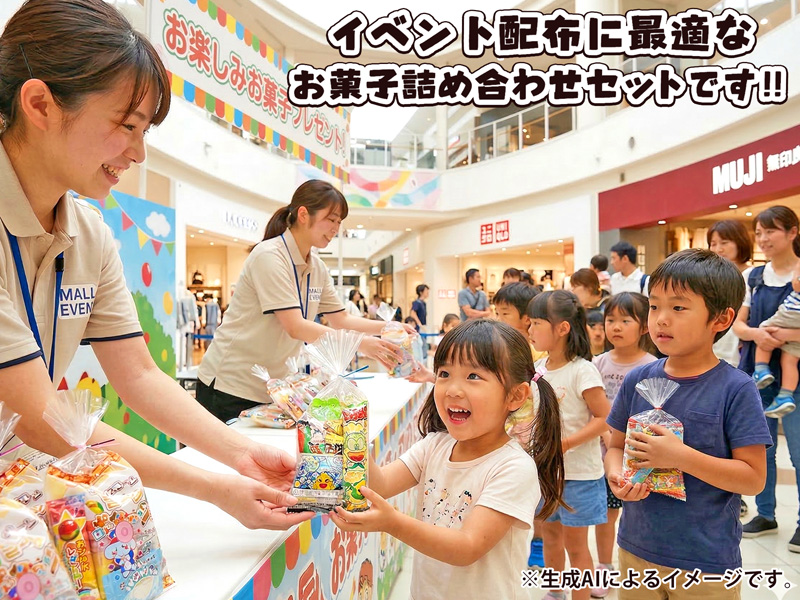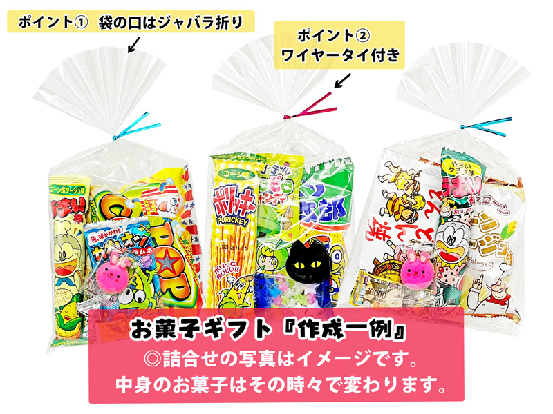 - セット内容…1袋の中に(約5種類)のお菓子が入ります。…(※その時々でお菓子の内容は変わります。)