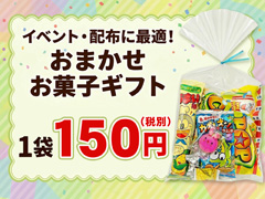 【※納品は最短でも10日~かかります。一緒にカートに入れた商品も同じ納期になるので、不都合がある場合はご注文を分けてください。】各種イベント配布に最適な、おまかせお菓子ギフトセットが登場~!こちらは1袋あたり150円(税別)のお菓子詰め合わせセット。子供たちにウケのよいお菓子が約5種類程入っています。1セット(100袋)単位からのご発注となりますので、大規模なイベント・催事で多くのギフトが必要な際に大変オススメです。