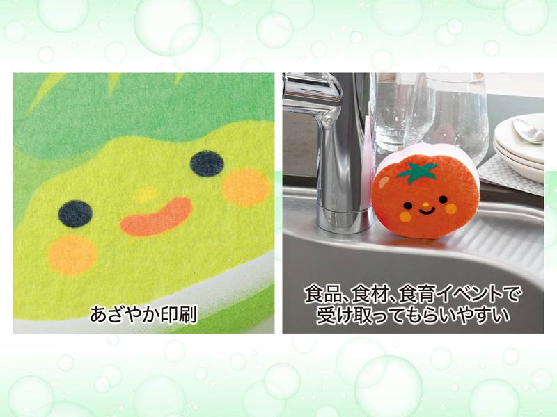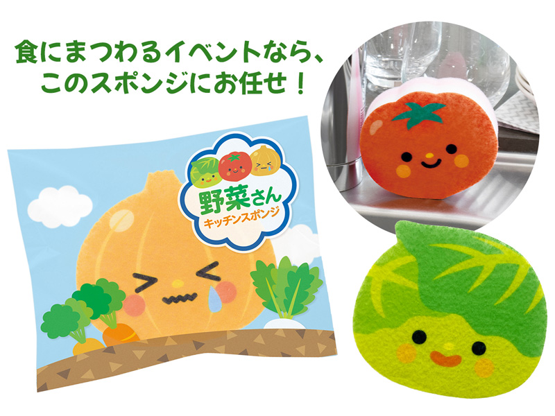 「キッチンスポンジ」は、ノベルティグッズの王道中の王道!消耗品であるため、いくつあっても困らず、だれもがその実用性を実際に感じることができる...多くの方が喜んで受け取ってくれるアイテムです。こちらの野菜さんキッチンスポンジは『キャベツ・トマト・タマネギ』の3種ミックスで、食品・食材・食育イベントなどにピッタリ!タマネギちゃんは、ちょっぴり目がしみているという、細部までこだわったデザインなんです♪
