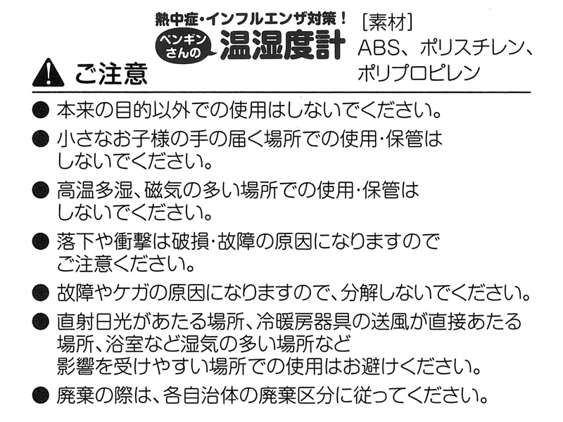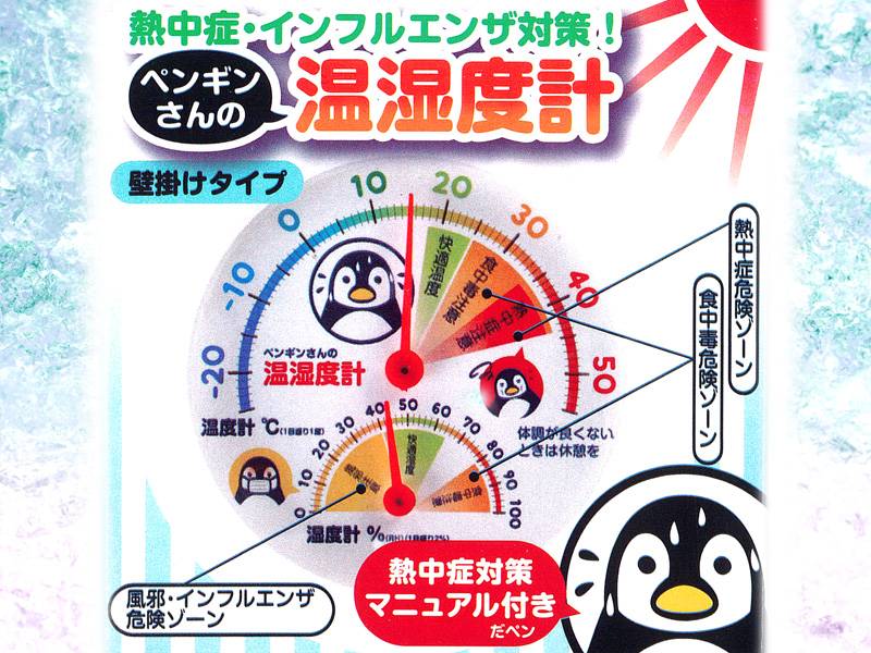 熱中症対策やインフルエンザの注意喚起に!ペンギンさんのデザインがかわいい、壁掛けタイプの温湿度計が登場~♪目盛りがさした数字で危険な温度、湿度が一目でわかる、すぐれものなんです♪熱中症対策、そしてインフルエンザ・風邪対策に、1年中活躍いたします。