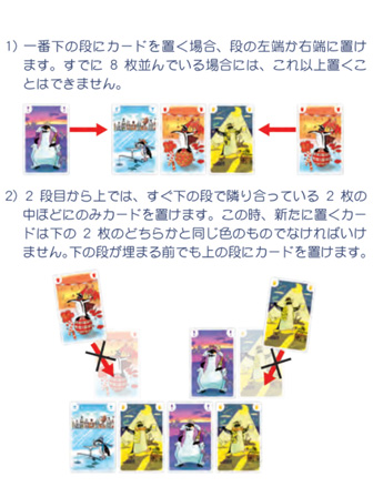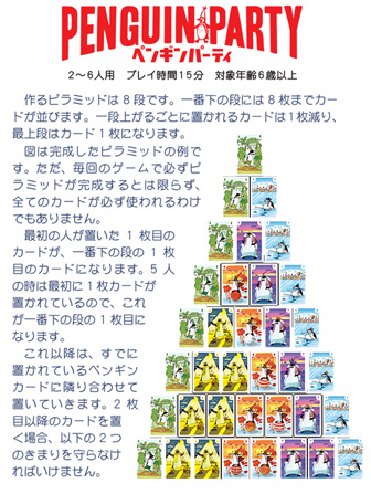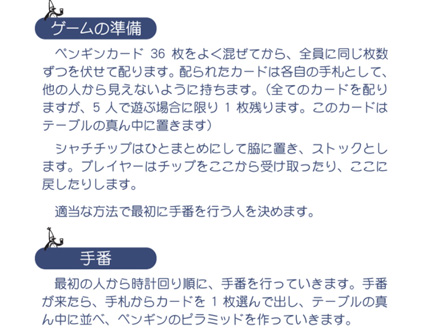 【ペンギンパーティ】とは?…自分の手札にあるペンギンをできるだけたくさんピラミッドの上にのせていきましょう。 ・カードを出せなくなってしまうと手元に残ったカードの枚数分、シャチのチップ(マイナスポイント)を受け取ります。逆に手札をすべて出し切ることができれば、引き取ったマイナスポイントを返していくこともできます。 ・人数分のラウンドを行ってゲーム終了となります。ゲーム終了時、マイナスポイントが一番少ない人が勝ちです。