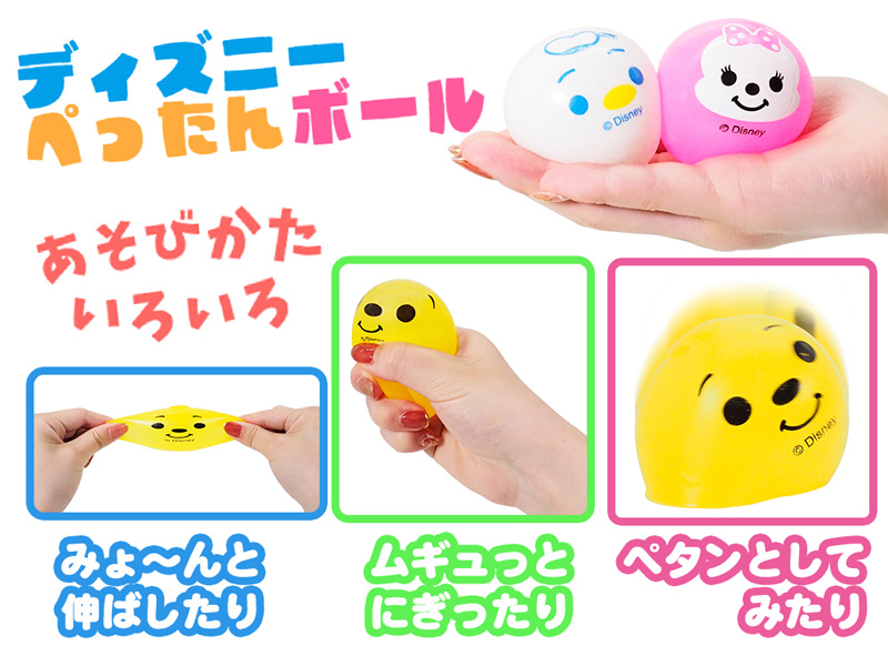 握って『ぐにゅ~っ!』投げて『ぺったん!』ディズニーキャラクターの顔柄ぺったんボールが登場~!握った時のグニュグニュした不思議な感触が子ども心をくすぐります!ガラスや壁にぶつけてもペタッと張り付いてすぐ元に戻るのでストレス発散などにもってこいですよ。