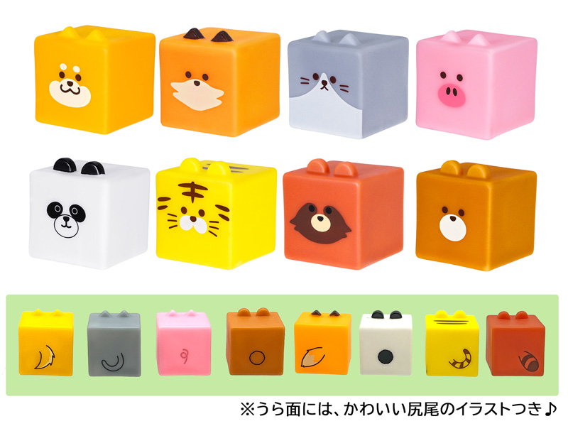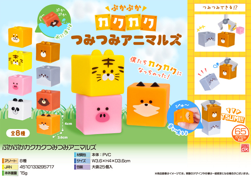 僕たちカクカク四角くなっちゃた!お祭りやイベントで大活躍!かわいいアニマルたちがつみつみできるぷかぷかマスコットが登場~♪かわいいアニマルは全8種類、笛付きで押すとピューと音が鳴ります。水に浮かびますので、縁日イベントのすくい・浮かし景品にゼヒ。