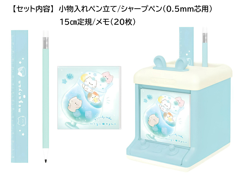 - セット内容:小物入れ付きペン立て×1・シャーペン(0.5mm芯対応)×1・15cm定規×1・ミニメモ(本文20枚)×1