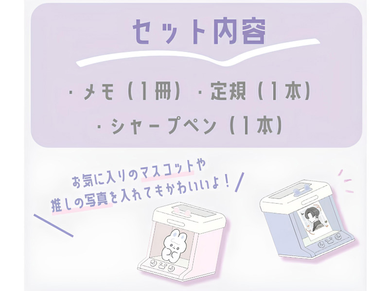 プライズマシーン風のケースがかわいいボリュームのあるステーショナリーギフトセットが登場♪ペンスタンド、0.5mmシャープ、15cm定規、ミニメモの4点セット。ペンスタンドの中にはお気に入りのマスコットや推しの写真を入れて飾ってもGood!個人用にはモチロン、お誕生日のプレゼント・記念品・贈り物などにオススメです!