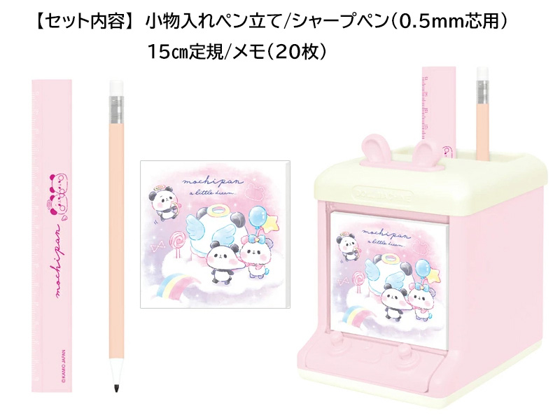 - セット内容:小物入れ付きペン立て×1・シャーペン(0.5mm芯対応)×1・15cm定規×1・ミニメモ(本文20枚)×1