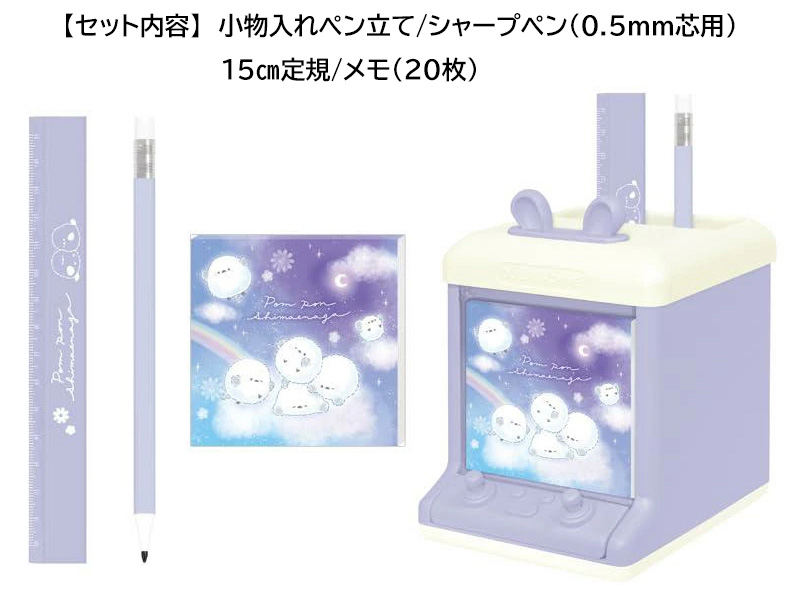 - セット内容:小物入れ付きペン立て×1・シャーペン(0.5mm芯対応)×1・15cm定規×1・ミニメモ(本文20枚)×1