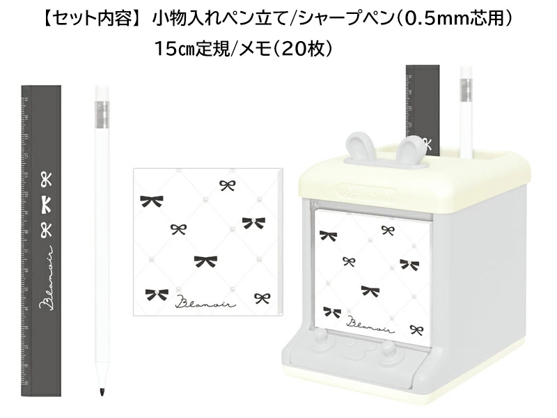 - セット内容:小物入れ付きペン立て×1・シャーペン(0.5mm芯対応)×1・15cm定規×1・ミニメモ(本文20枚)×1