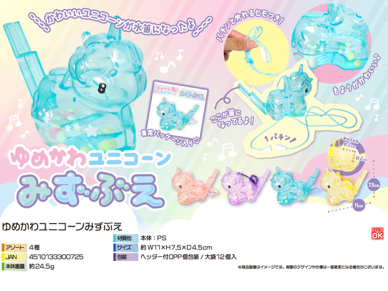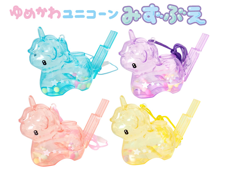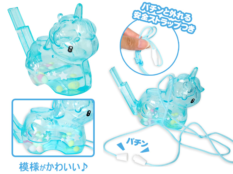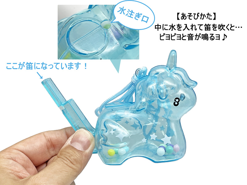 縁日・イベントの景品やお風呂遊びのおもちゃにオススメ!昔懐かしい「水笛」にかわいい【ユニコーン】モチーフが登場♪中に水を入れて笛を吹くと…ピロピロピロロ~と楽しい音が鳴ります♪本体カラーは全4色。ストラップヒモつきなので首から下げて持ち歩くこともできます。