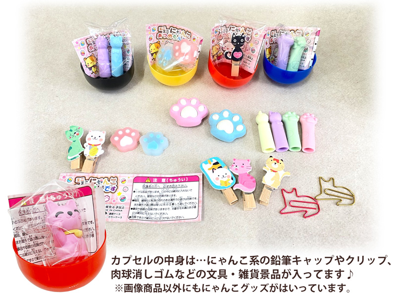 カプセルの中にいろんな種類のにゃんこグッズが入っている、つかみ取りタイプのBOXくじが登場~♪カプセルの中身は…にゃんこの鉛筆キャップやクリップ、肉球消しゴムなどの文具雑貨系の景品が中心です。