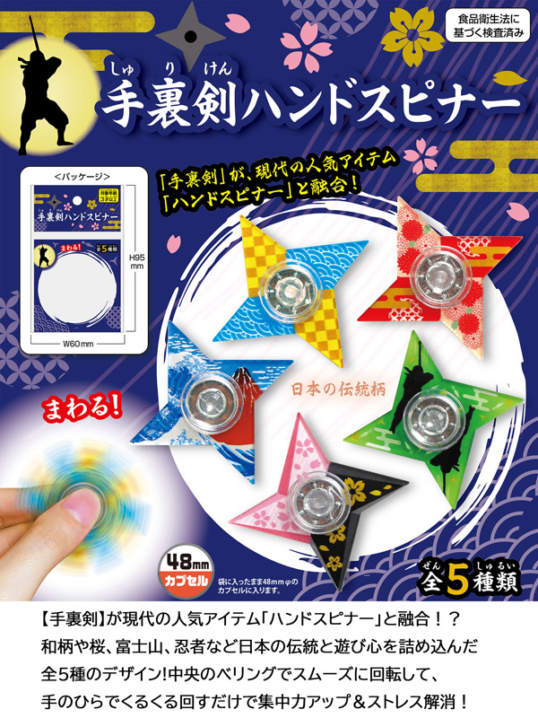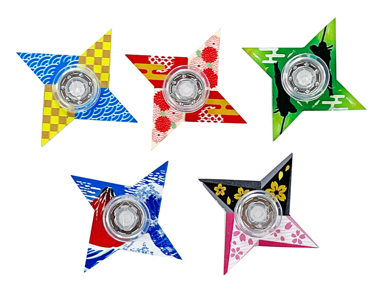 忍びの武器「手裏剣」が現代のアイテム「ハンドスピナー」と融合!和柄や桜、富士山、忍者など日本の伝統と遊び心を詰め込んだ全5種類のデザイン。中央のベアリングでスムーズに回転し、手のひらでくるくる回すだけで集中力&ストレス解消!テーマパークのお土産や販促景品やインバウンド商品などにもオススメです!