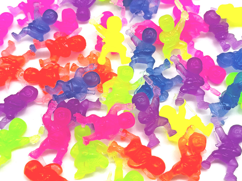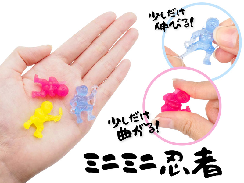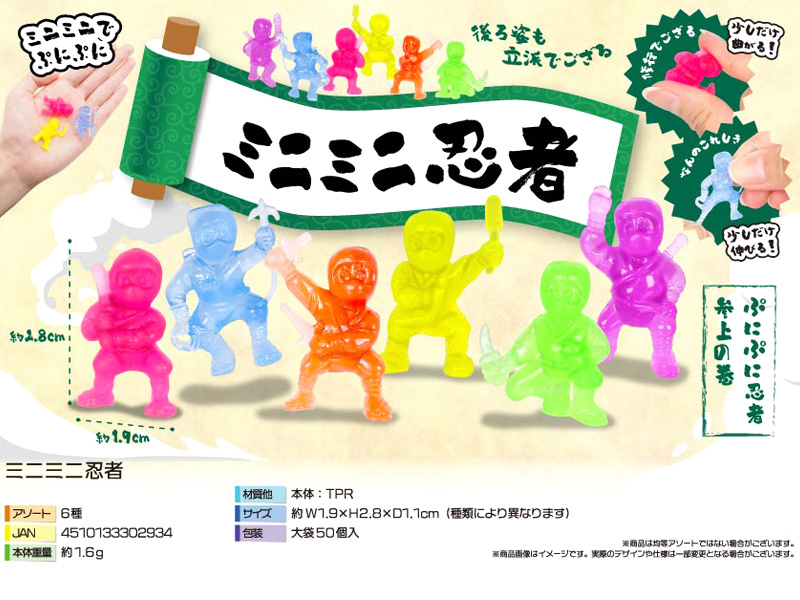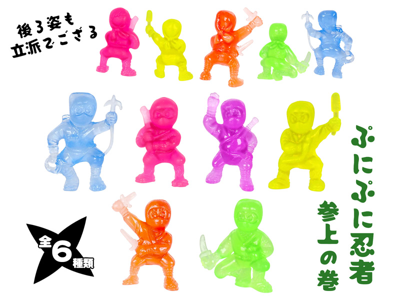 ぷにぷに忍者ただいま参上!「忍者」モチーフのすくい人形が登場です。全長約2.8cmのカラフルなミニ忍者は全6種類。TPR素材で少しだけ伸びたり曲がったり、ぷにぷにとした感触をお楽しみいただけます。水に浮かぶのでお祭り・縁日のすくい景品などにオススメです。
