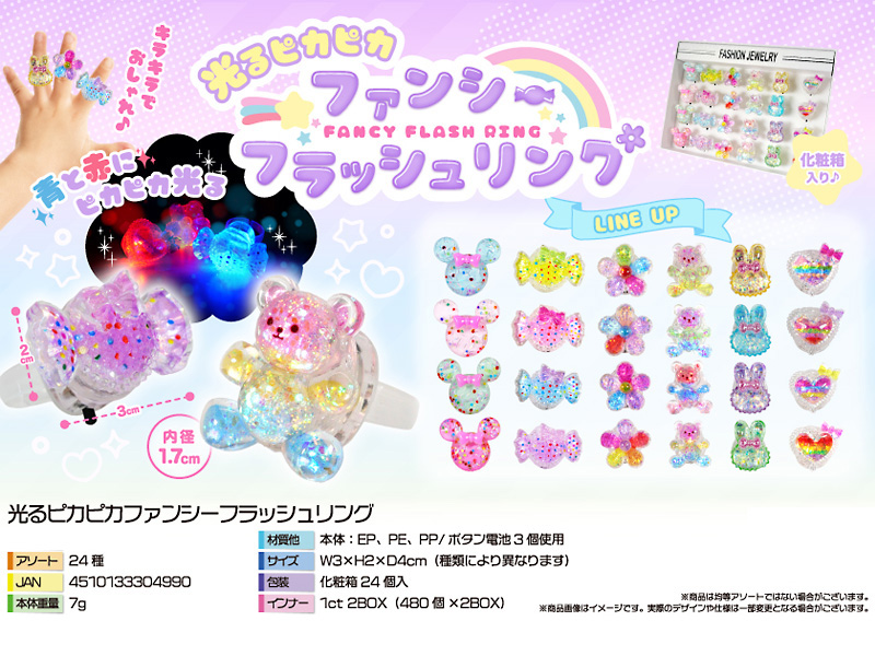 クリスタルな質感がとってもキレイな光る指輪「光るピカピカファンシーフラッシュリング」が登場~☆☆彡指輪のモチーフは全6種類。電源をONにすると…指輪が赤・青のひかりにピカピカ点滅します。縁日お祭りなどの光るおもちゃ景品にもおススメ♪デザインも可愛らしいので電池が切れてもそのままオシャレなファンシーンリングとしてご活用いただけますヨ!