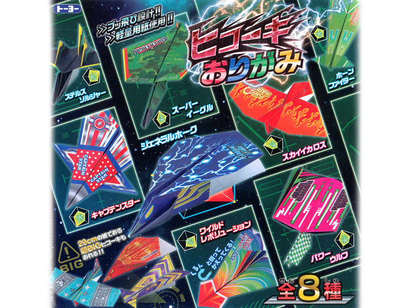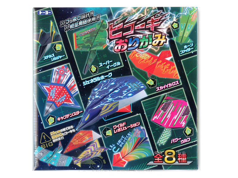 カッコイイ紙飛行機が折れる『ヒコーキおりがみ』が登場~!8種類のよく飛ぶ紙ヒコーキと3種類のMEGAサイズ紙ヒコーキが作れます。紙ヒコーキに最適な普通の折り紙よりも薄い紙を使用!紙の重さが少なく、ヒコーキが軽くより飛びやすくなっています。それぞれの形と合わさり滞空時間強化型や飛距離強化型など、実際に飛ばして試してみよう!