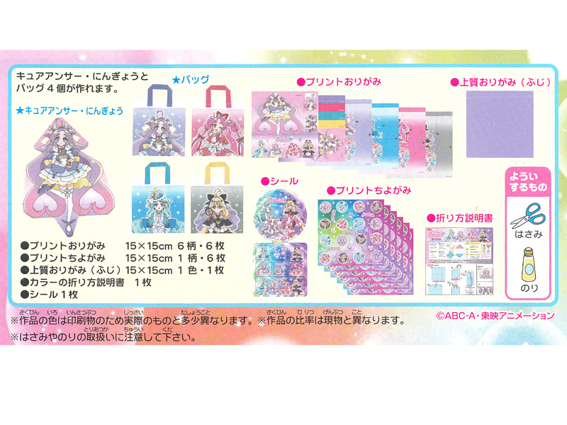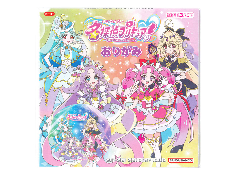 シリーズ第23作【名探偵プリキュア!】のおりがみセットが登場~♪ふつうの色紙のほかにキャラクター柄プリントちよがみにキャラクターシール。そしてキュア・アンサーの人形とハンドバッグが折れるプリントおりがみも付いています。