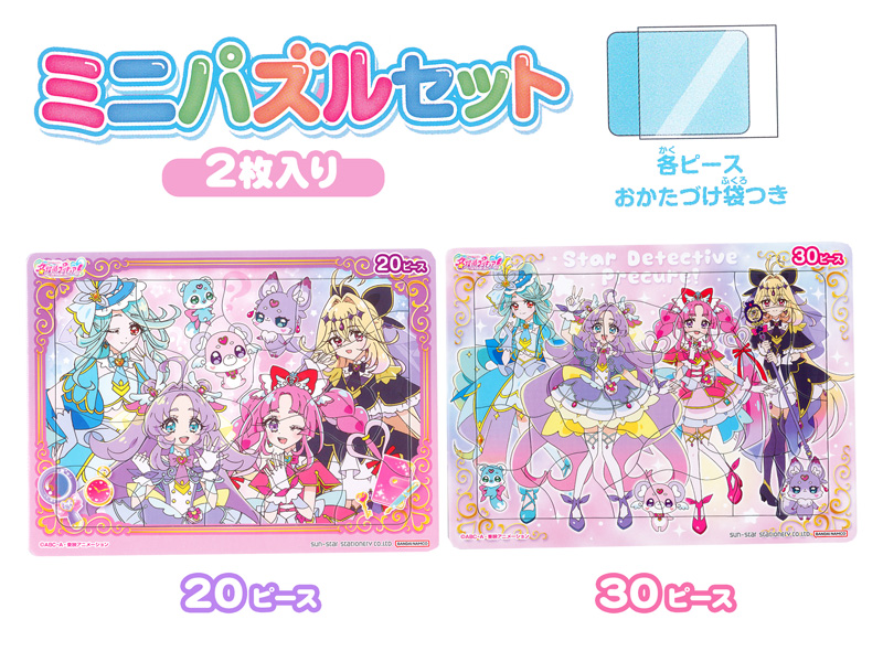 キャッチコピーは…そのナゾ!キュアット解決!シリーズ第23作【名探偵プリキュア!】よりミニパズルセットが登場!パズルは20ピースと30ピースの2枚セット。従来のB4サイズの約半分程度の大きさなので、持ち運びもラクラクです♪ちなみに今回の作品は「探偵」をモチーフに、「自分で見て、感じて、考えて、“本当”の答えを出す」をテーマに、「困っている人を助けたい」という思いを胸に探偵として活躍する物語となっています♪